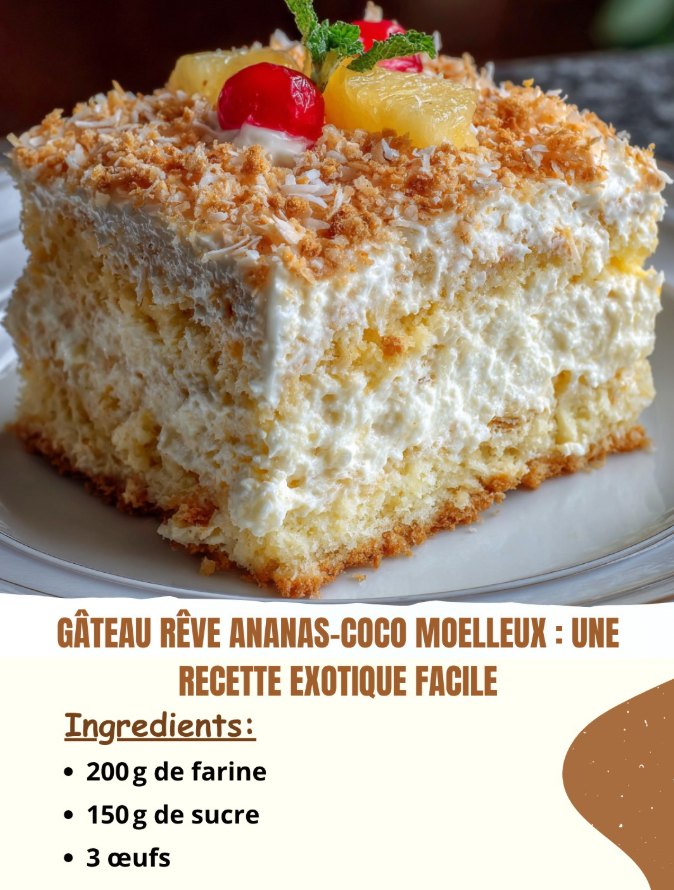 Gâteau Rêve Ananas-Coco Moelleux : Une Recette Exotique Facile Ingrédients : 200 g de farine 150 g de sucre 3 œufs 100 g de noix de coco râpée 1 sachet de levure chimique 150 ml de lait de coco 1 ananas (frais ou au sirop)