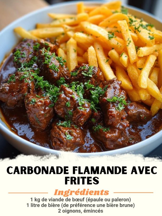 Carbonade Flamande avec Frites Ingrédients : 1 kg de viande de bœuf (épaule ou paleron) 2 oignons, émincés 2 cuillères à soupe d’huile d’olive 1 cuillère à soupe de farine