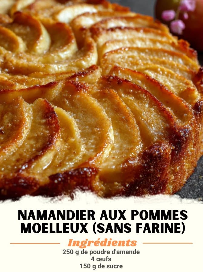 Namandier aux Pommes Moelleux (sans farine) Ingrédients : 250 g de poudre d’amande 4 œufs 150 g de sucre 100 g de beurre fondu 2 pommes (type Golden ou Granny Smith)