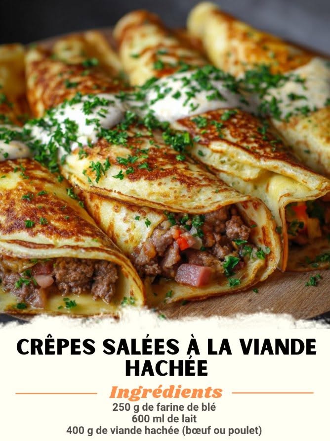 Crêpes Salées à la Viande Hachée Ingrédients : 250 g de farine de blé 3 œufs 600 ml de lait 1 pincée de sel 1 cuillère à soupe d’huile d’olive 400 g de viande hachée (bœuf ou poulet) 1 oignon, émincé