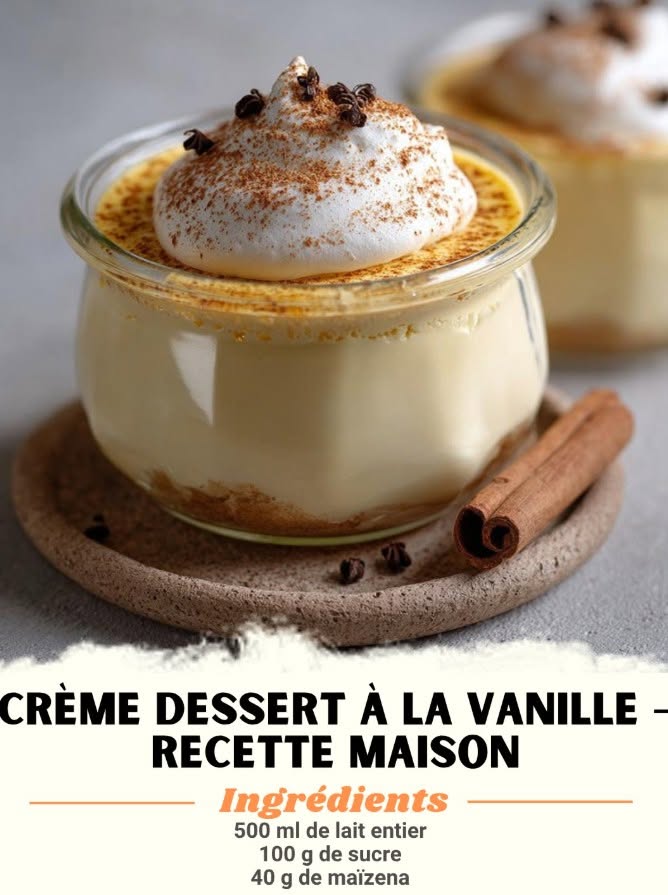 Crème Dessert à la Vanille – Recette Maison Ingrédients : 500 ml de lait entier 100 g de sucre 40 g de maïzena